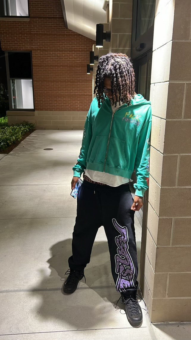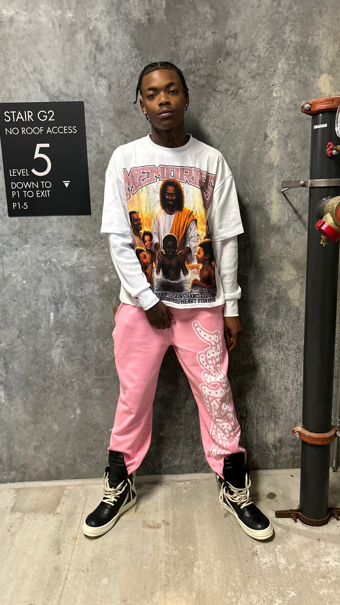 FALSE MEMORIES FALSE SIDE LETTERMENT RHINESTONE SWEAT PANTS BLACK AND PINK